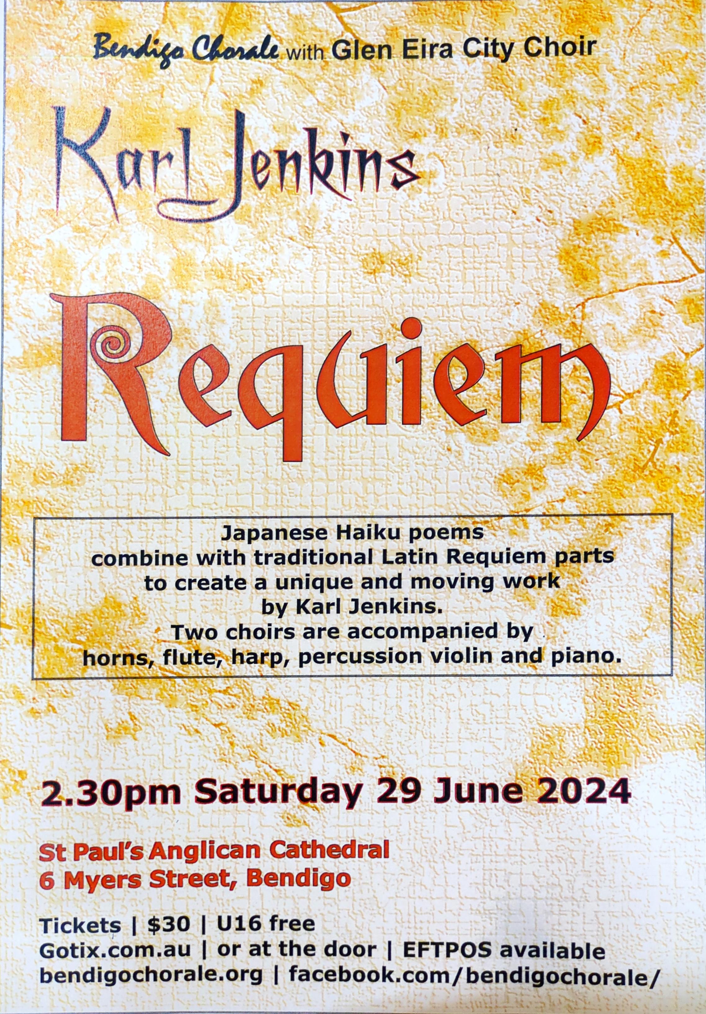 The Bendigo Chorale and soloists will be performing selections from Requiem by Karl Jenkins, Concerto in D for two violins by J.S. Bach, Horn Concerto No.1 by Richard Strauss and choral pieces by John Rutter, John Tavener, Robin Pecknold and Benjamin Britten.