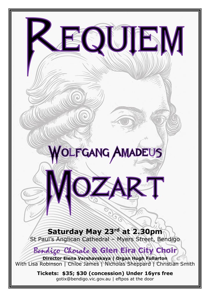 The Bendigo Chorale and soloists will be performing selections from Requiem by Karl Jenkins, Concerto in D for two violins by J.S. Bach, Horn Concerto No.1 by Richard Strauss and choral pieces by John Rutter, John Tavener, Robin Pecknold and Benjamin Britten.